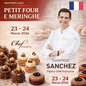 Non perdere questa esclusiva MasterClass il 23 e 24 Marzo 2026 dalle ore 09:00 alle 17:30, riservata ad un numero limitato di partecipanti, che avranno l’opportunità di realizzare le preparazioni previste insieme al Pastry Chef Valentin Sánchez